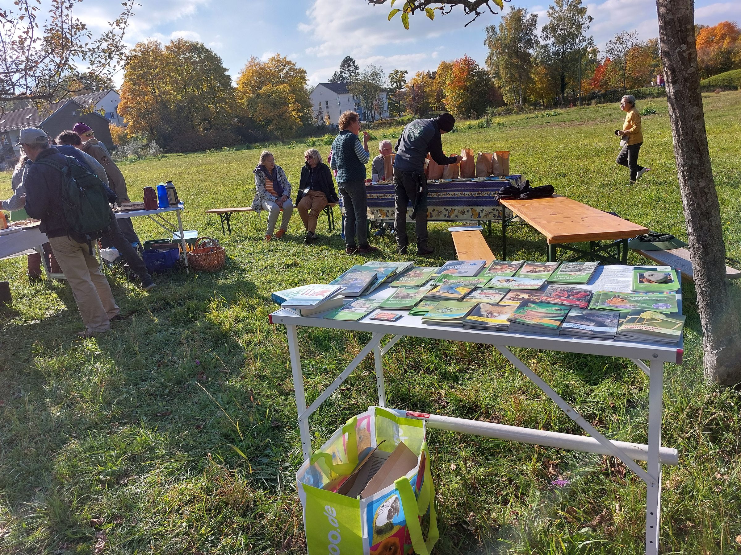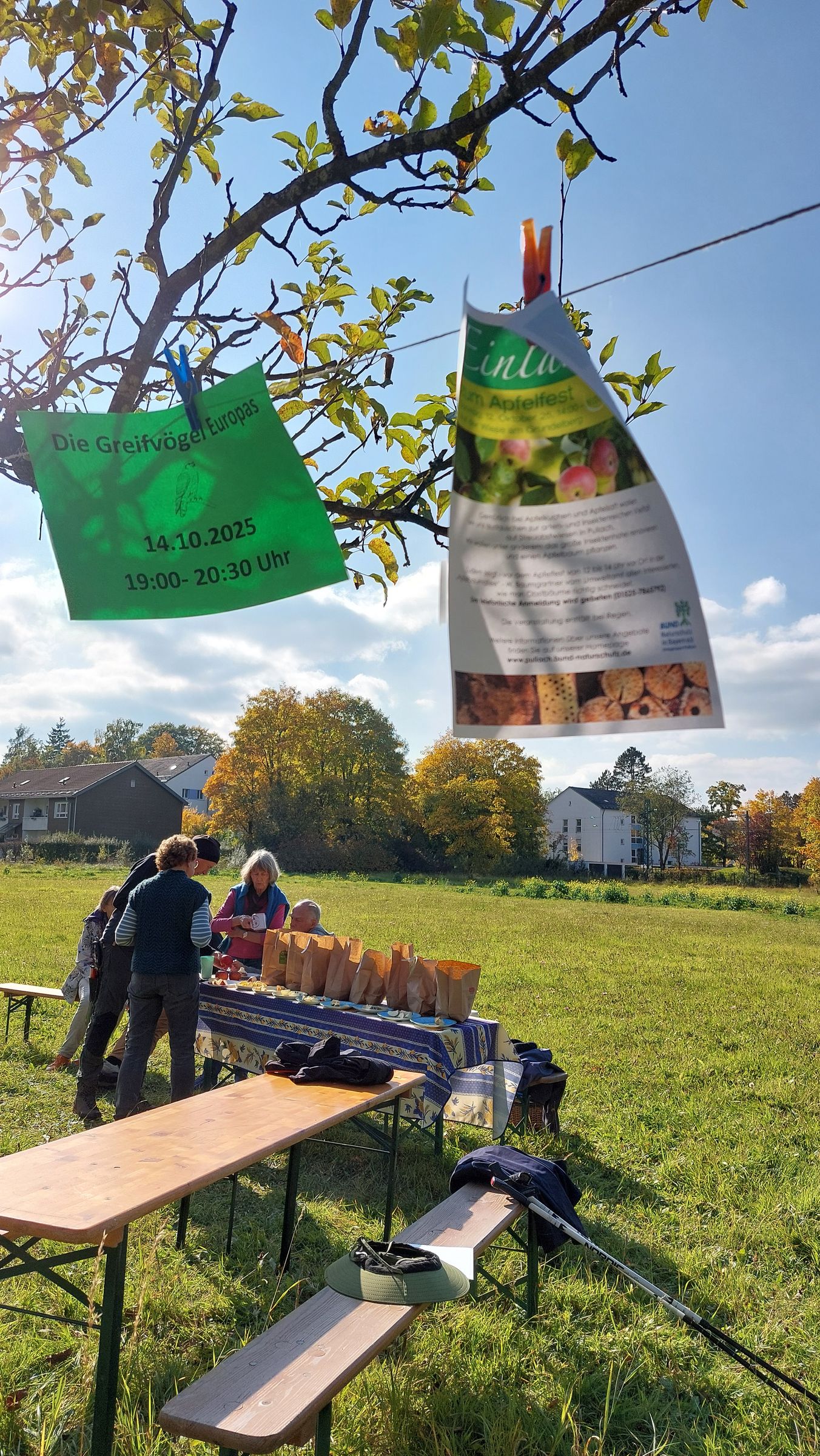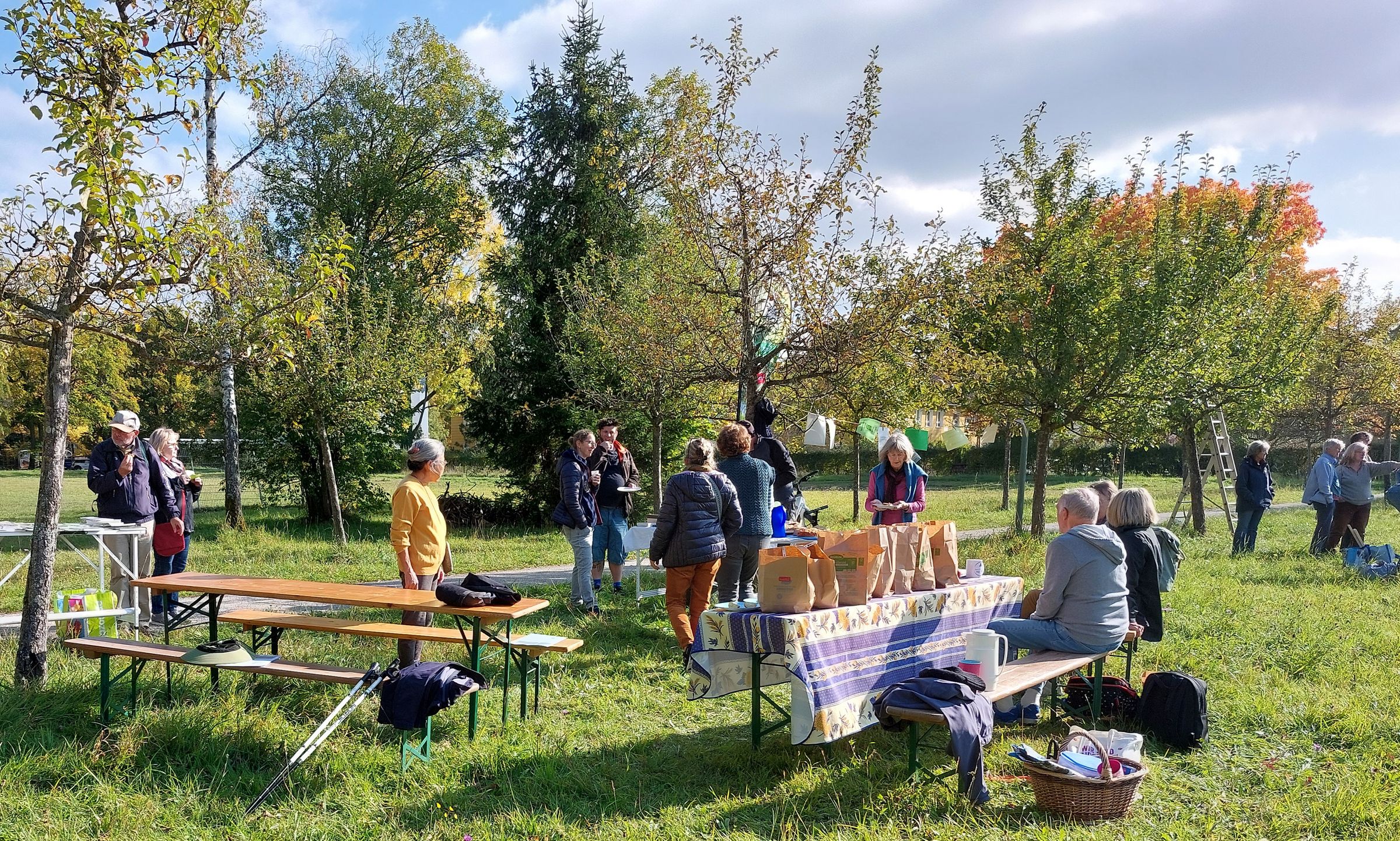Das Wetter war gut, ein sonniger Herbsttag im Oktober. Unsere Ortsgruppe hat eingeladen zu einem gemütlichen Beisammensein mit Apfelsaft und Apfelkuchen an von unserer BN-Jugend vor 24 Jahren angelegten Apfelbaum-Allee an dem asphaltierten Spazierweg mitten durch die Wiese. Gepflanzt wurden seinerzeit alte Apfelsorten wie z.B. Gravensteiner, Kaiser Alexander, Berner Rosenapfel uvm. Nachdem die Äpfel dort schon weitestgehend abgeerntet waren bzw. noch im Gras verrotteten, haben wir uns für eine Apfelverkostung der Besucher*innen die Bio-Äpfel von Sorten, die es im Supermarkt nicht zu kaufen gibt, versorgt bei der Obstgärtnerei Braunhold in Gauting. So konnten wir anbieten: Roter Topaz, Kaiser Wilhelm, Goldparmäne, Finkenwerder Herbstprinz u.a.