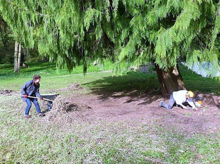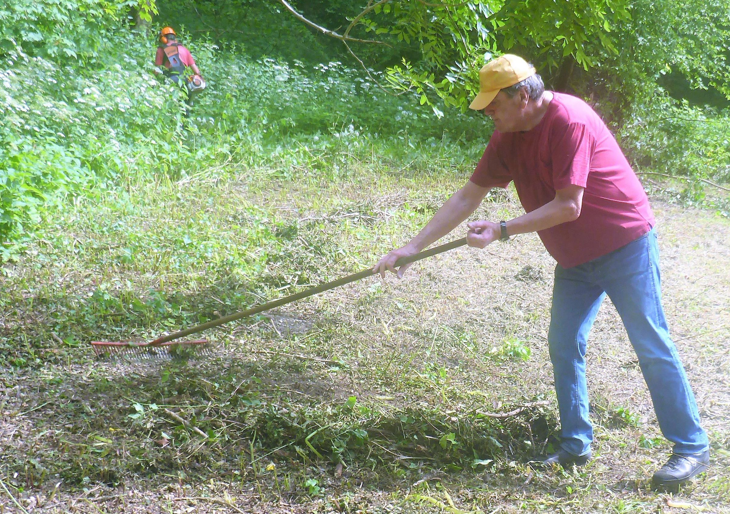 Im Oktober wurden wir noch einmal zur Mithilfe gerufen und (fast) alle Aktiven kamen, um erneut Toni und seinen Leuten vom "Weißen Raben" beim Rechen und Aufhäufen des Schnittgutes zu helfen: Elke und Hans-Werner, die schon bei den früheren Einsätzen in diesem Jahr dabei waren sowie neu Birgit und Gabriele.