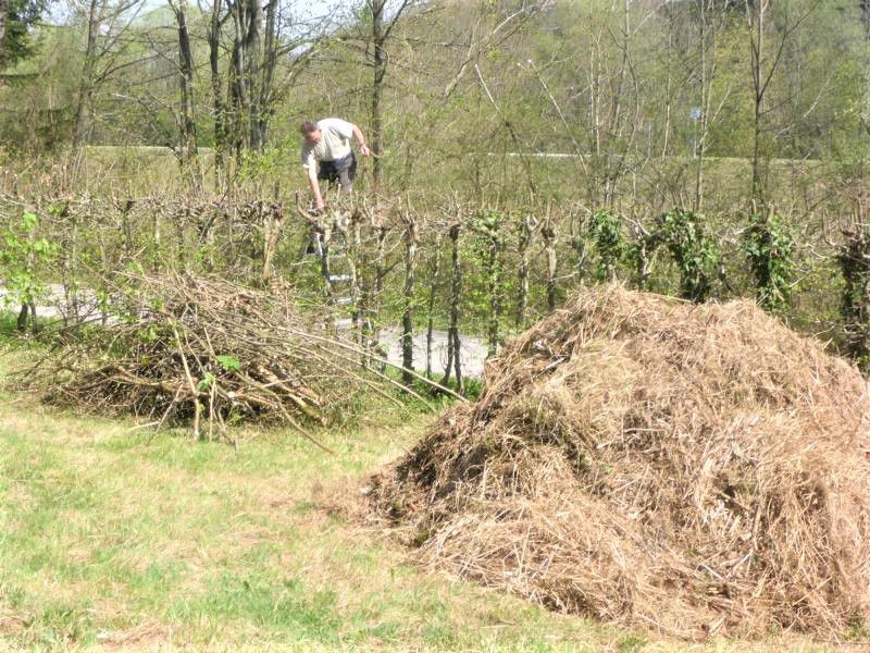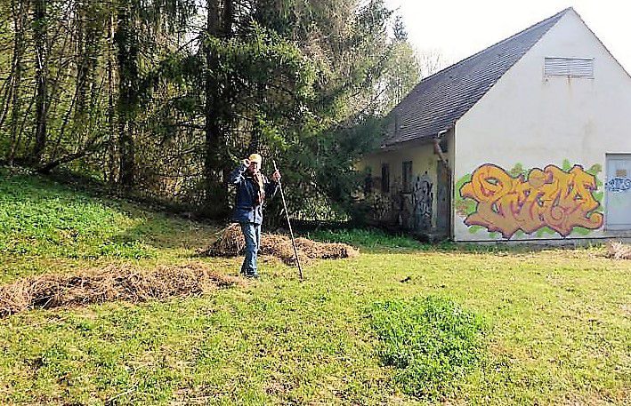 Am Morgen des 12. April 2017 bei strahlendem Sonnenschein meldete sich also die Ortsvorsitzende mit zwei älteren Mitgliedern der Ortsgruppe, die an einem Werktag Zeit hatten, zum Dienst an der Natur. Toni, der jahrelang für den LBV tätig gewesen war und sich als Experte in der hiesigen Pflanzen- und Tierwelt herausstellte, begrüßte uns als Mitarbeiter der Firma. Mit einem Balkenmäher begann er die Wiese zu mähen und unsere Aufgabe war es, das Mähgut zusammen zu rechen und an den Wiesenrand zu transportieren, wo es dann später mit dem LKW abgeholt und zu einer Biogasanlage gebracht werden sollte. Zudem waren allerlei abgebrochene Äste und morsche Stämme beiseite zu räumen. Am Nachmittag wurde dann noch die Hecke neben dem Radweg geschnitten und das Schnittgut kam auch auf den großen Haufen.