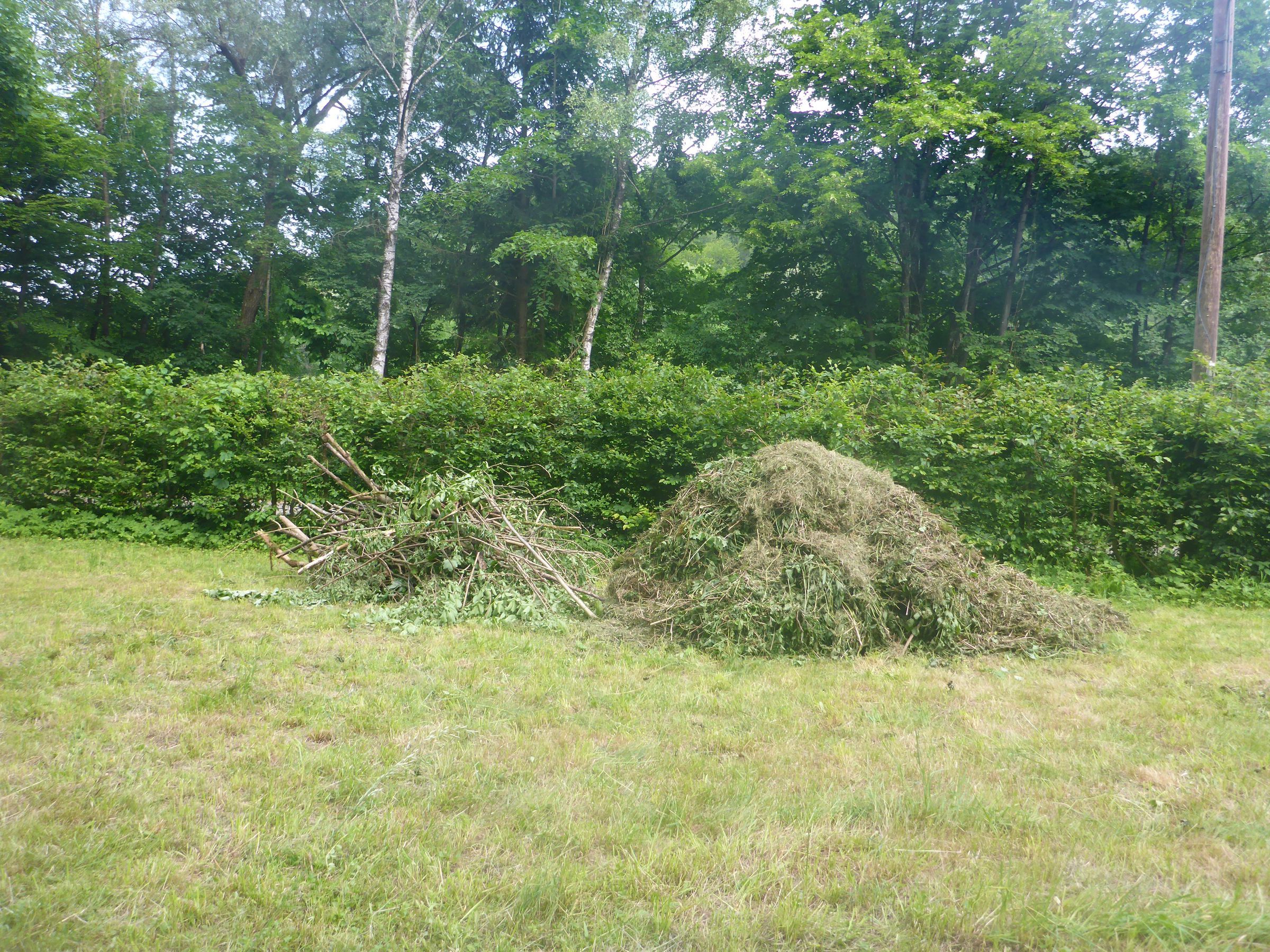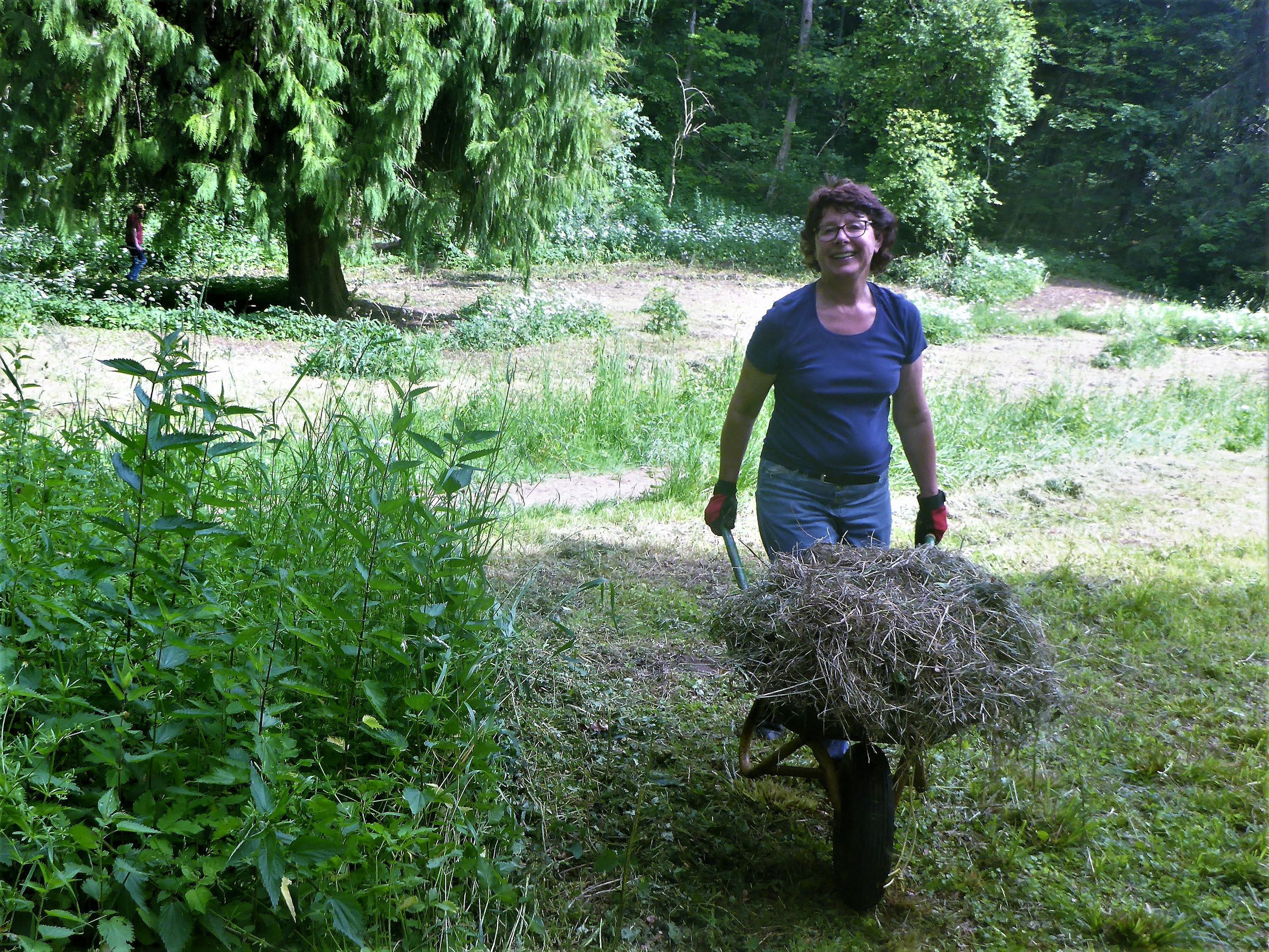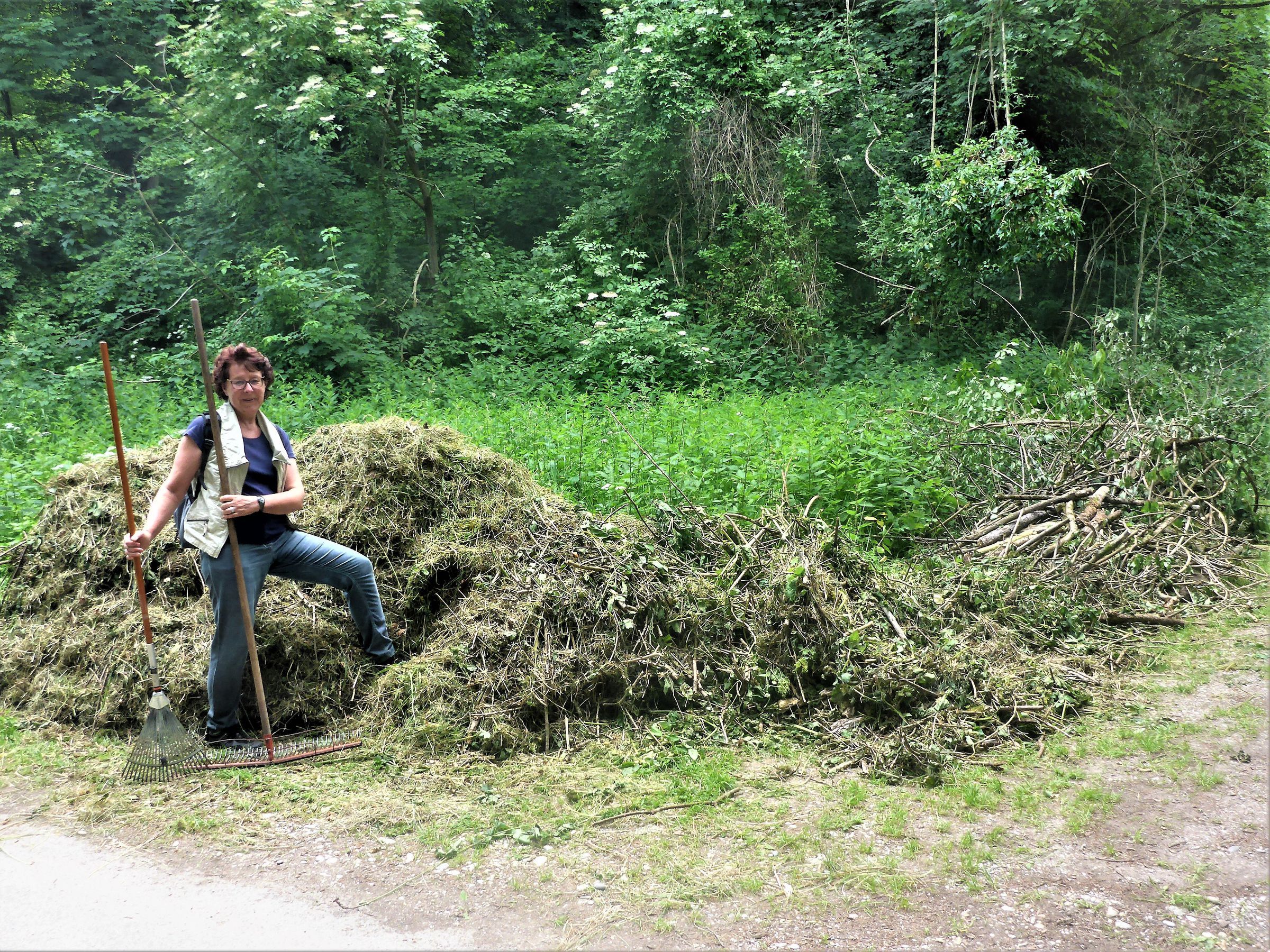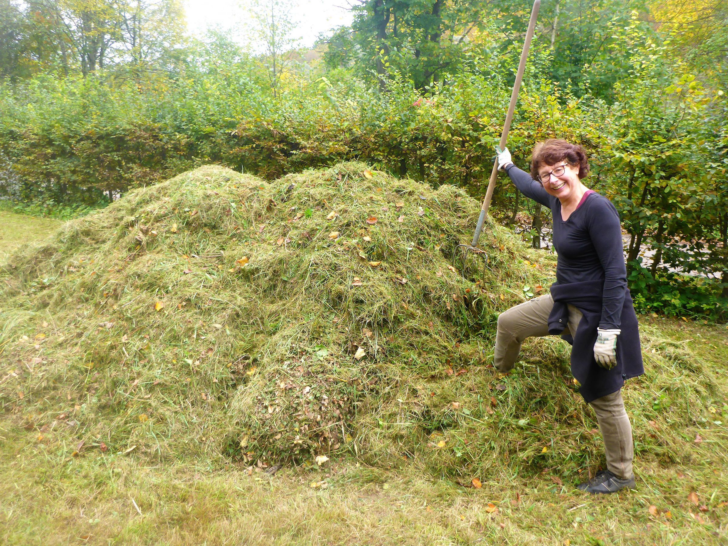 Ließe man nun die Mahd auf der Wiese liegen, würde das Mähgut - ebenso wie die Blätter nach dem Laubfall im Herbst - langsam verrotten, die darin enthaltenen Nährstoffe würden den Boden wieder anreichern (geschlossener Kreislauf). Eine nährstoffarme Wiese könnte so nicht entstehen. Deshalb muss das Mähgut nach der Mahd der Wiese entzogen werden. In früheren Jahren bestand unsere Aufgabe darin, die größte Menge des Mähguts zu meterhohen Haufen zusammenzutragen. Dann wurde es zur "Entsorgung" per LKW abtransportiert.