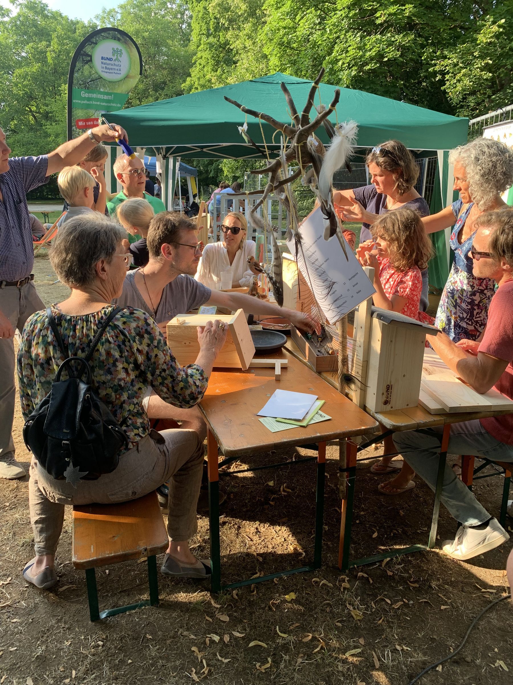 Ein Highlight der ersten Woche war das Fest am 5.7. auf der Maibaumwiese in Pullach (sieh Fotos unten). Neben Ständen der Schulen des Ortes, des Kreisjugendrings, der VHS Pullach, der SOLAWI-Isartal und vielen mehr, konnten die Besucher unseres Stands Vogelnistkästen zusammenbauen und gleich mitnehmen zum Aufhängen an geeigneten Bäumen oder Wänden. Darüber hinaus gab es hilfreiche Tipps und Anregungen für den vogelfreundlichen Garten und den Naturschutz vor Ort, im Garten oder Balkon. Unser Angebot wurde freudig angenommen, vor allem von Familien mit Kindern.