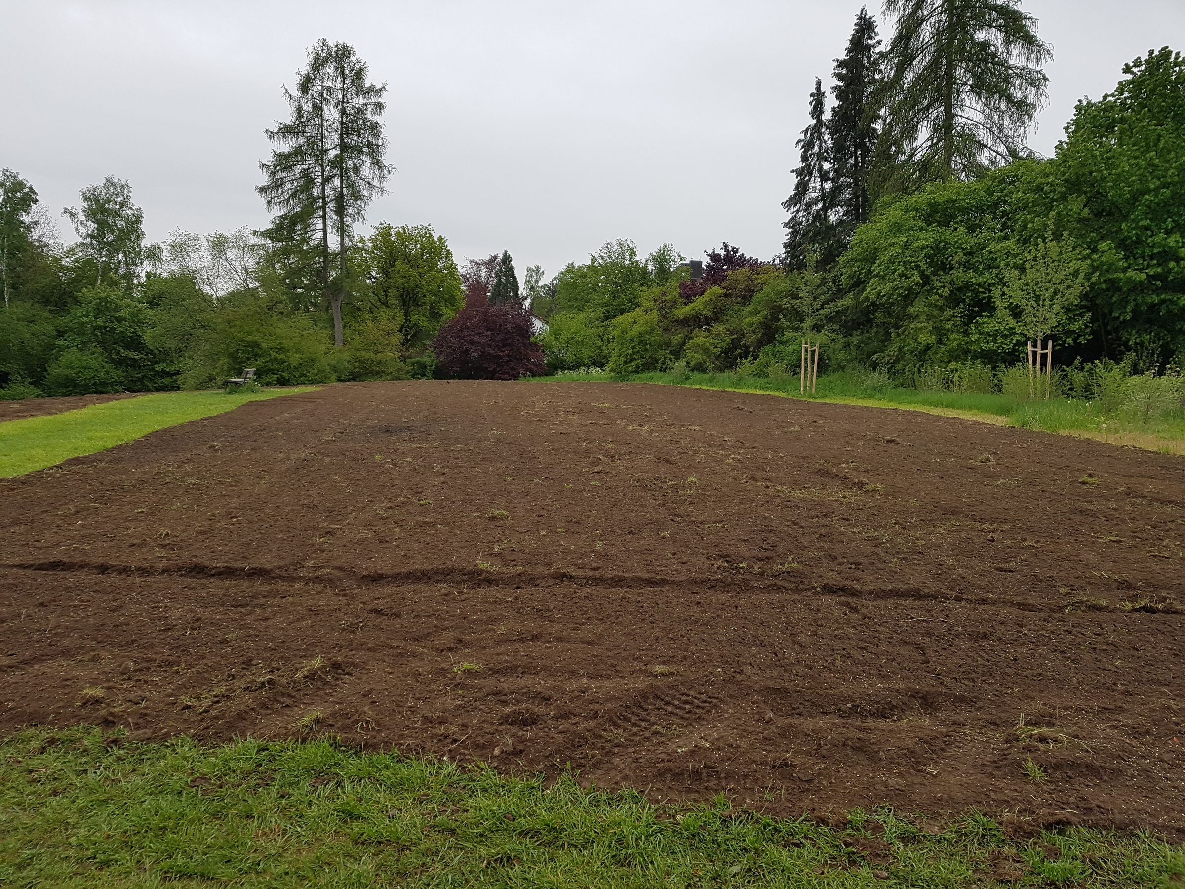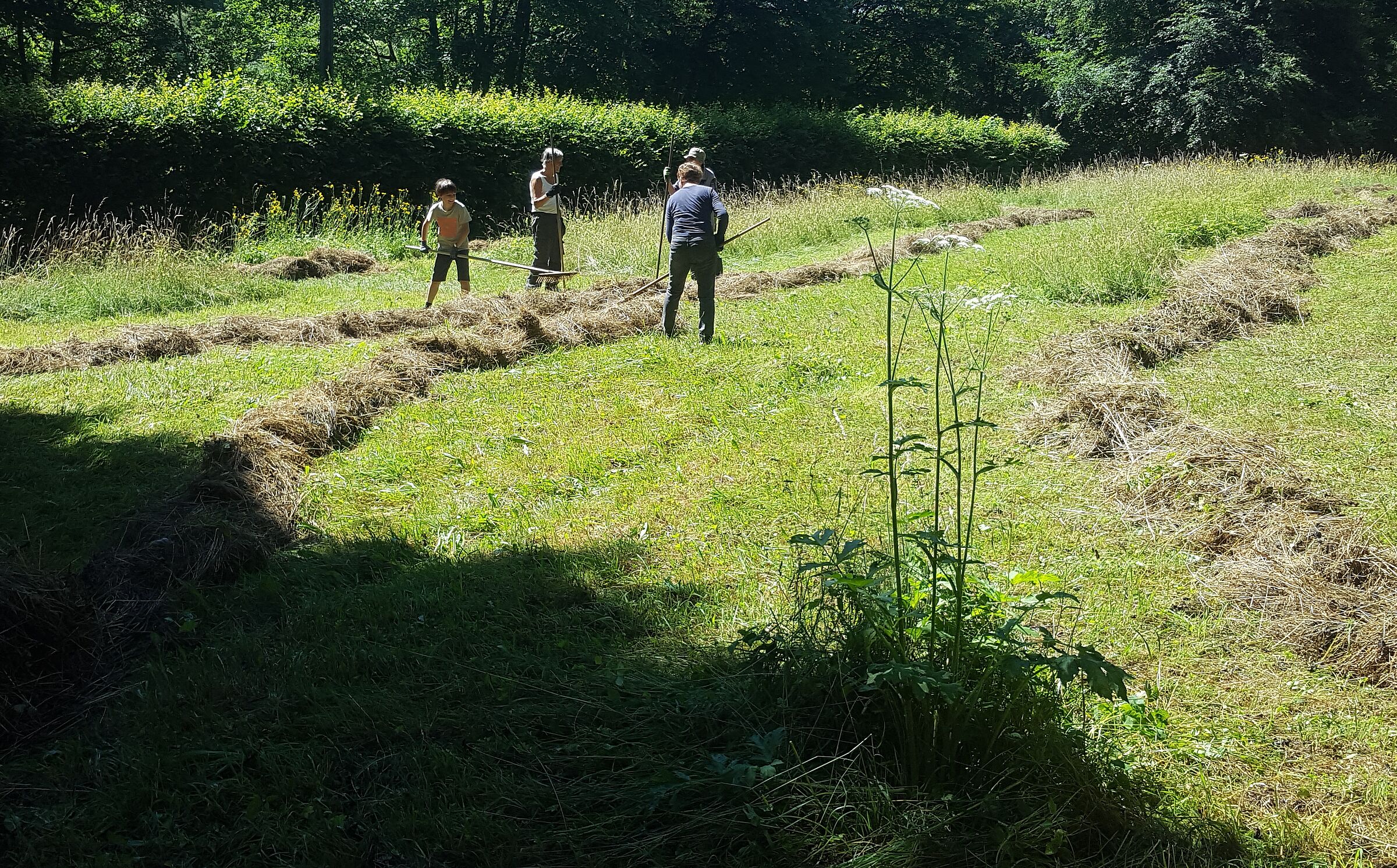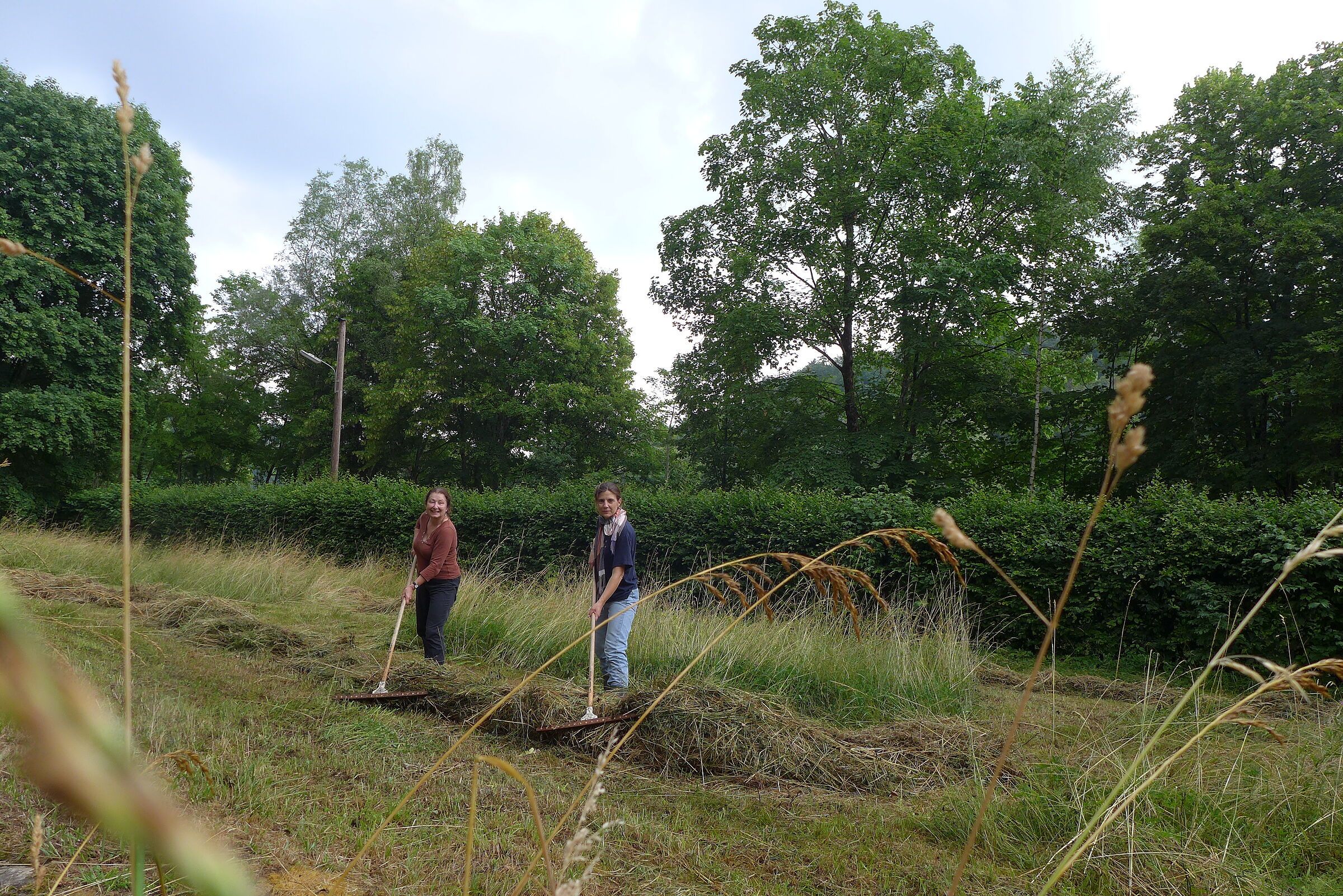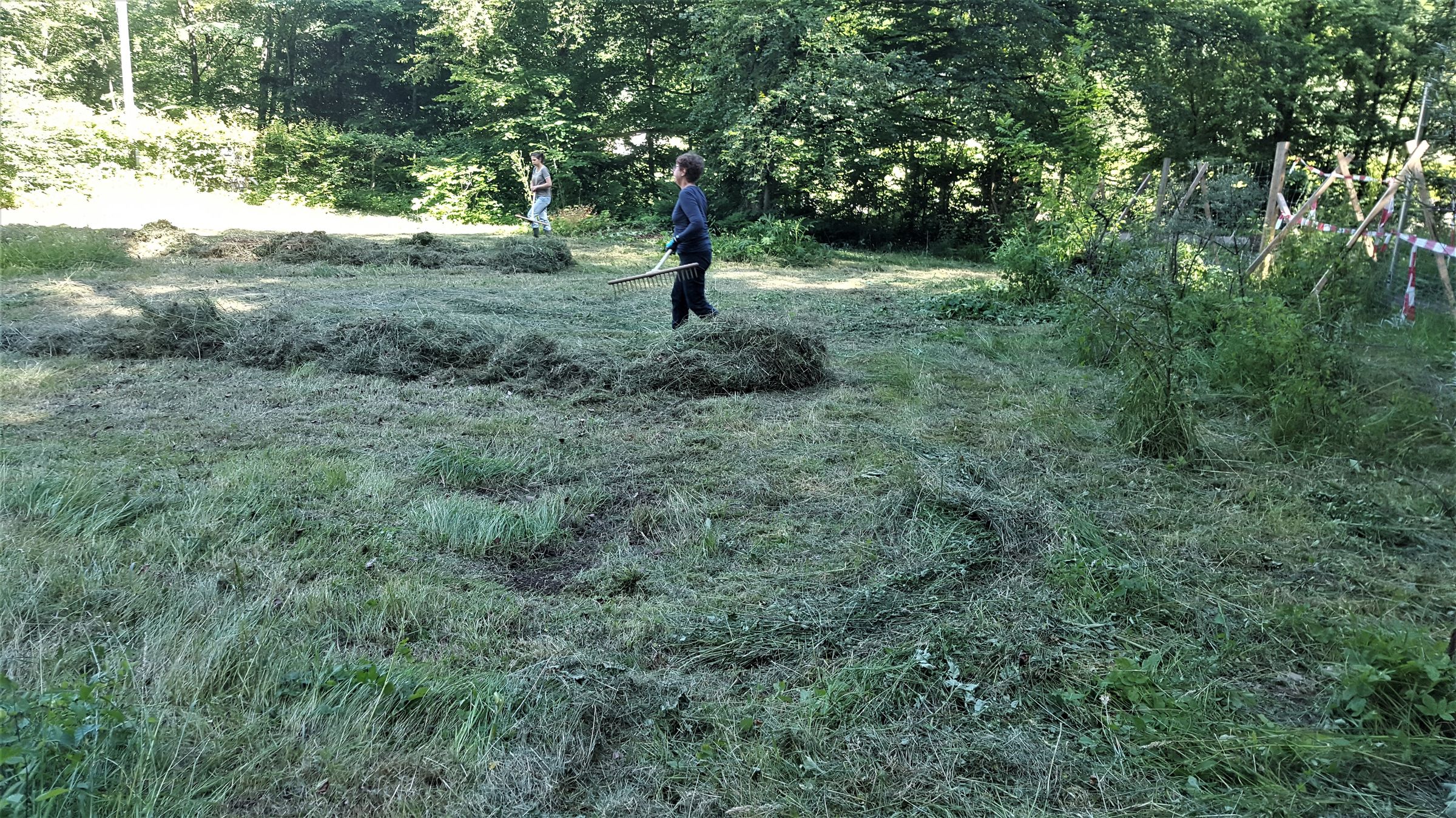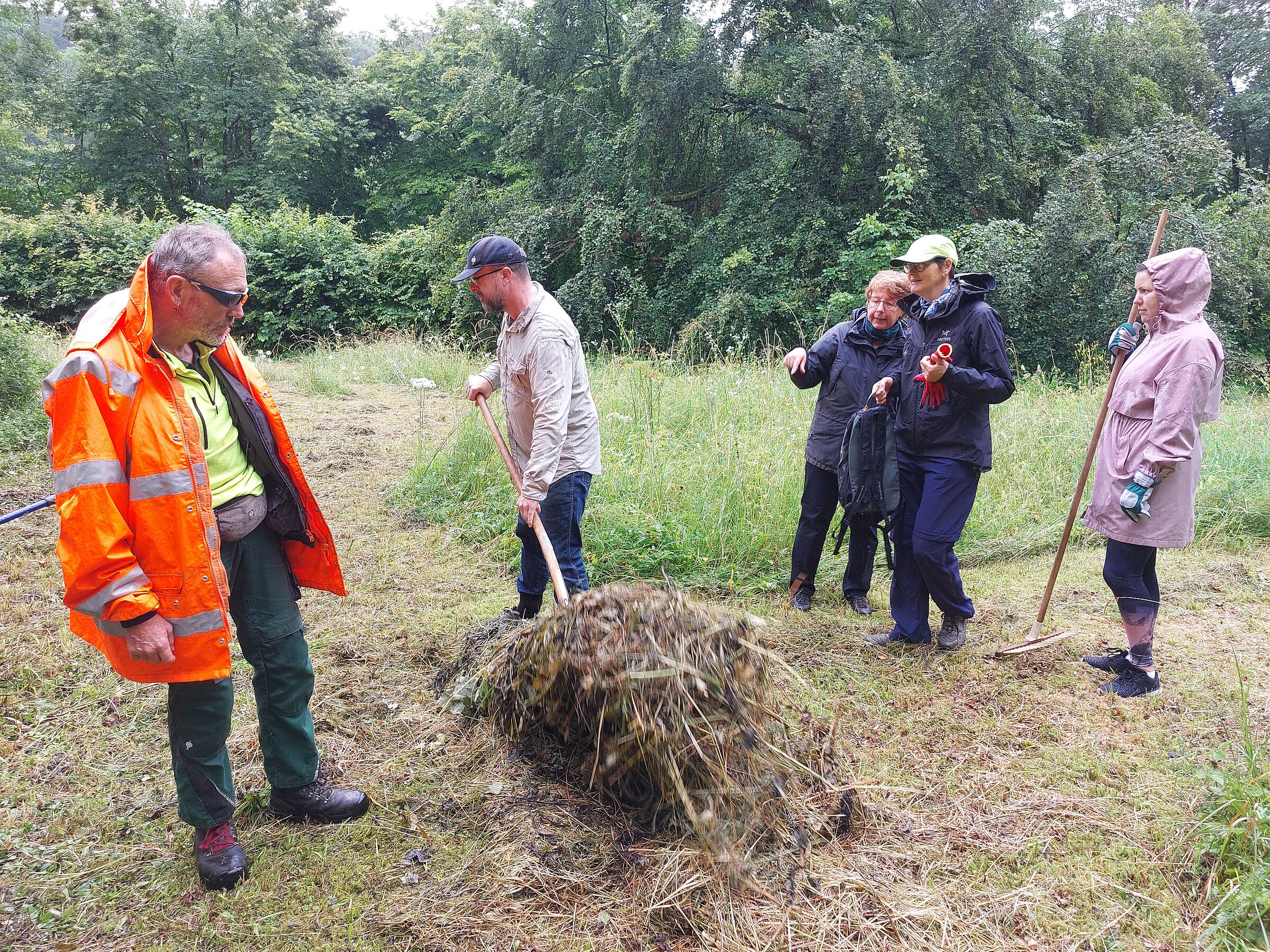 Wir ließen uns von den widrigen Wetterumständen am Morgen nicht abschrecken und schritten zur Tat. Die Mitarbeiter der Firma IFCO unterstützten uns im Rahmen eines Volunteering -Tages mit vollstem Elan. Dadurch schafften wir es innerhalb nur eines Vormittags, die Wiese zu rechen und das Mähgut zum Abtransport auf die Seite zu schaffen.