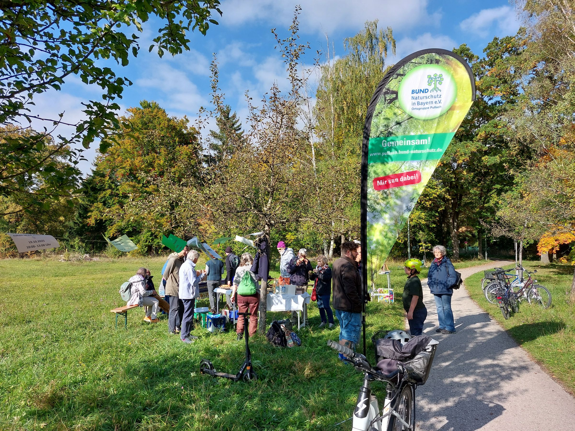 Das Wetter war gut, ein sonniger Herbsttag im Oktober. Unsere Ortsgruppe hat eingeladen zu einem gemütlichen Beisammensein mit Apfelsaft und Apfelkuchen an von unserer BN-Jugend vor 24 Jahren angelegten Apfelbaum-Allee an dem asphaltierten Spazierweg mitten durch die Wiese. Gepflanzt wurden seinerzeit alte Apfelsorten wie z.B. Gravensteiner, Kaiser Alexander, Berner Rosenapfel uvm. Nachdem die Äpfel dort schon weitestgehend abgeerntet waren bzw. noch im Gras verrotteten, haben wir uns für eine Apfelverkostung der Besucher*innen die Bio-Äpfel von Sorten, die es im Supermarkt nicht zu kaufen gibt, versorgt bei der Obstgärtnerei Braunhold in Gauting. So konnten wir anbieten: Roter Topaz, Kaiser Wilhelm, Goldparmäne, Finkenwerder Herbstprinz u.a.