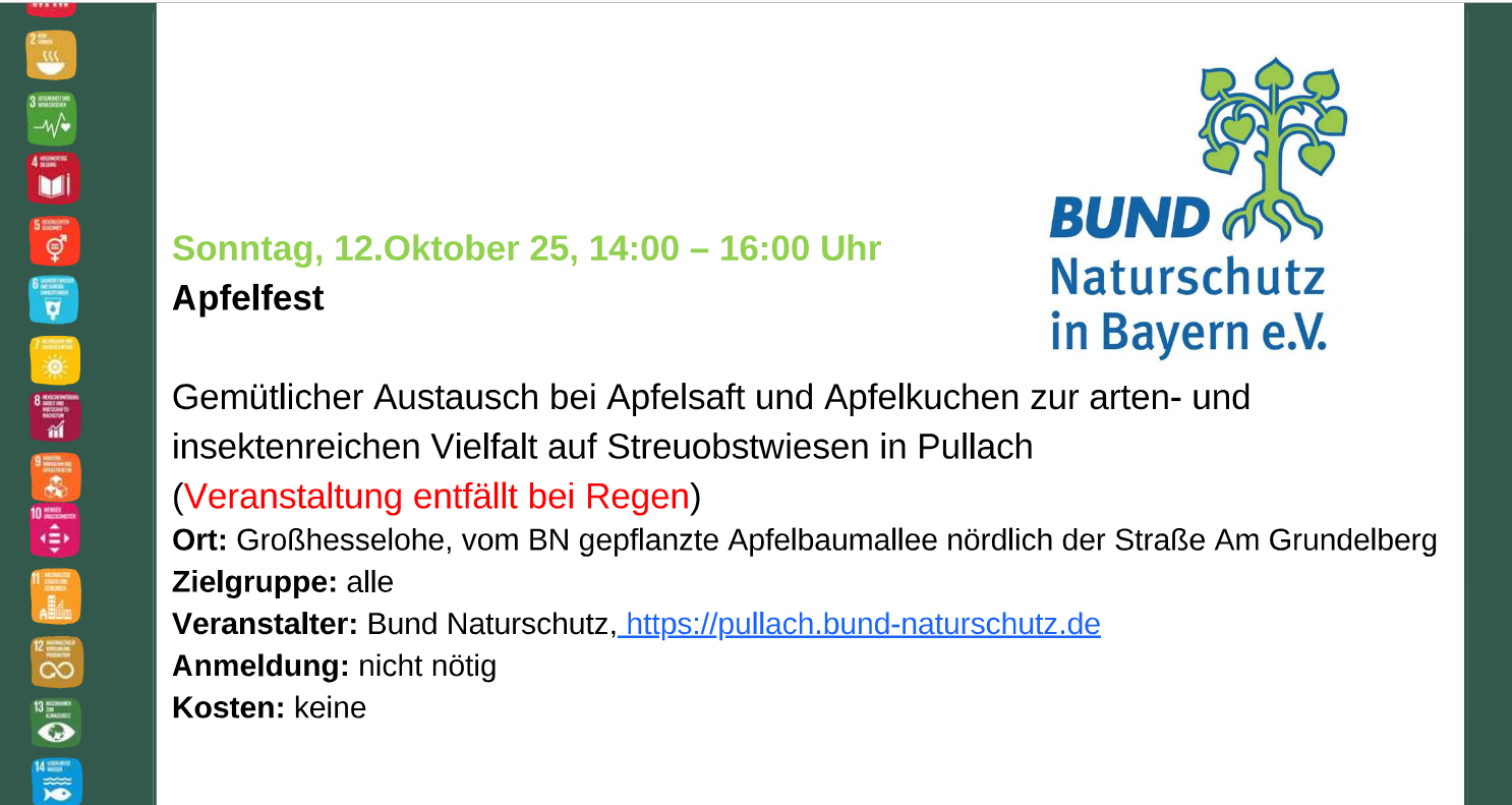In der zweiten SDG-Woche vom 11. bis 17.10.2025 planen wir ein Apfelfest an der - von unserer Jugendorganisation Ende 2001 gepflanzten - Apfelbaumallee am Grundelberg, sowie interessante Vorträge und Kurse mit der VHS Pullach.